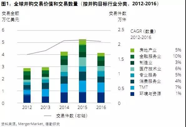 2015年全球并购市场交易金额创下超过5万亿美元的记录,2016年则出现了较大幅度的回落,同比下降22%与2014年持平。2016年并购交易回落的现象的主要受到了宏观经济以及政治层面两方面的制约。